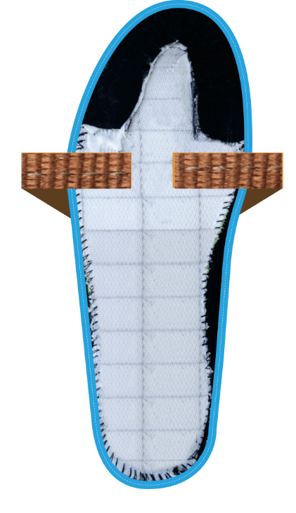 NASTRO CONDUTTIVO DI COTONE E FILI D’ARGENTO INTERNO ALLA TOMAIA E A CONTATTO CON IL PIEDE